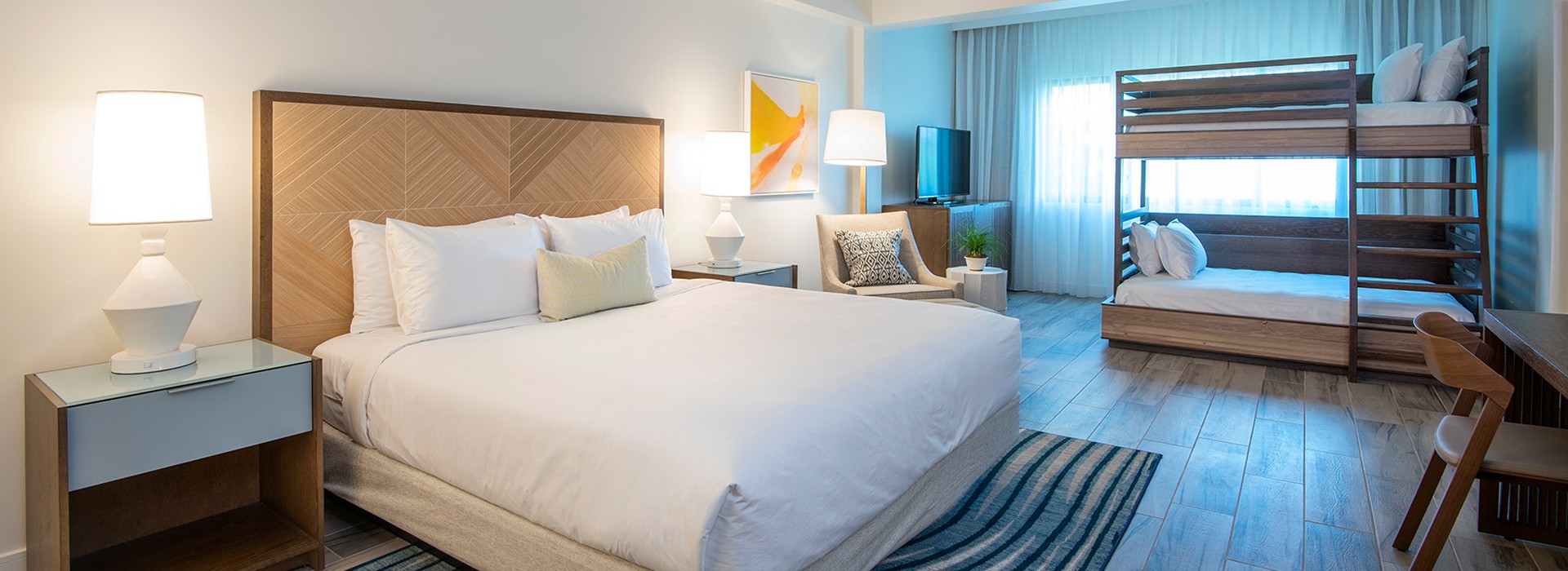 If the whole family is here for the ride, then the Family Guest Room can satisfy both your vacation needs and peace of mind. With a King size bed and a bunk bed with a full sized bed on the bottom, the kids will always be within arms’ reach and hopefully not causing too much havoc.